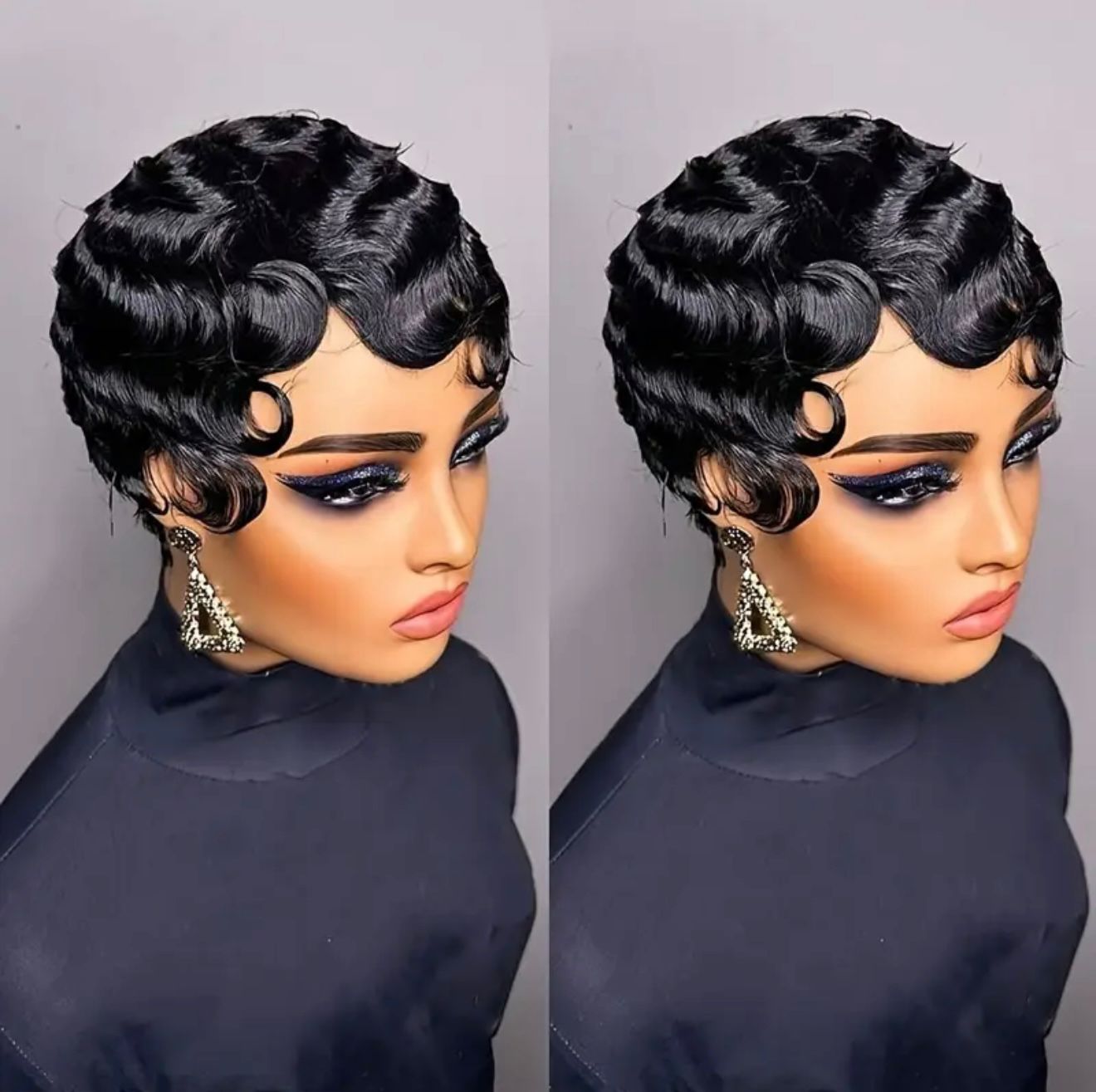 Short Pixie Cut Loose Curly Finger Wave 180% Density Human Hair Wig